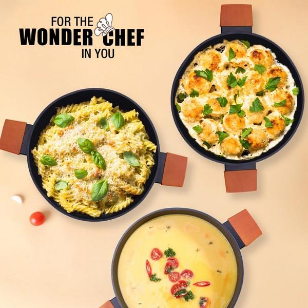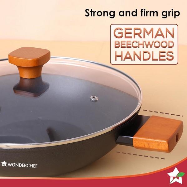 Pure Wood Handles: Caesar Forged Pans come with original German beechwood handles and a knob on the lid, with warm touch and stunning looks. Virgin Aluminium: Wonderchef cookware is made of 99.7% pure virgin aluminium without any chemicals or impurities. This ensures faster heat transfer avoiding burning of food, and the non-stick coating lasts much longer.