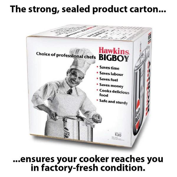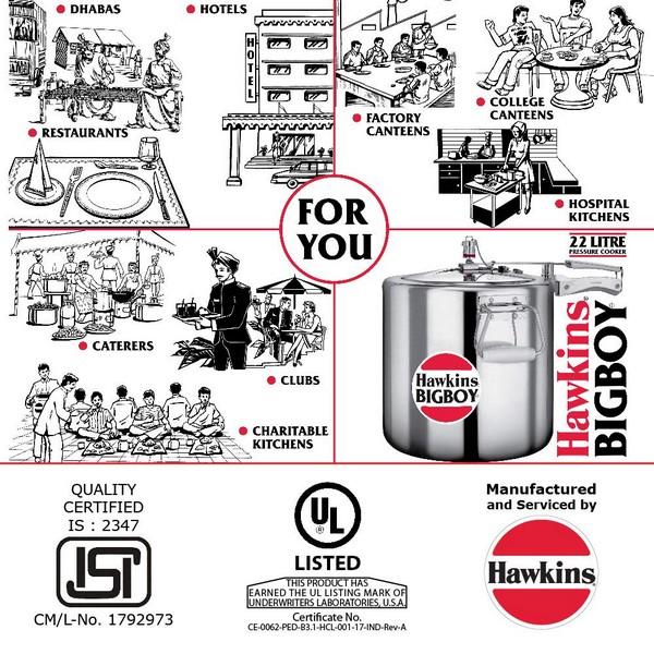 The Bigboy range has been specially designed to cook large quantities of food quickly. It is most useful in restaurants, hotels, canteens in factories, hospitals, schools and colleges. Also, canteens in many civil or military government establishments are using the Hawkins Bigboy. These quantities will cook in 29 to 48 minutes and would serve 50 to 100 persons. The 18 and 22 litre Bigboy pressure cookers have a pair of sturdy lifting handles attached to the sides of the pressure cooker for convenience in handling the heavy weight carried by such pressure cookers. The plastic handles of all Bigboy pressure cookers are made from reinforced fibreglass for extra strength. Similarly, all other components of Bigboy pressure cookers are made for heavy duty. A chain is attached to the vent weight to prevent loss in busy kitchens. Recommended for use on gas or kerosene stoves. They may also be used on coal burning or firewood stoves.