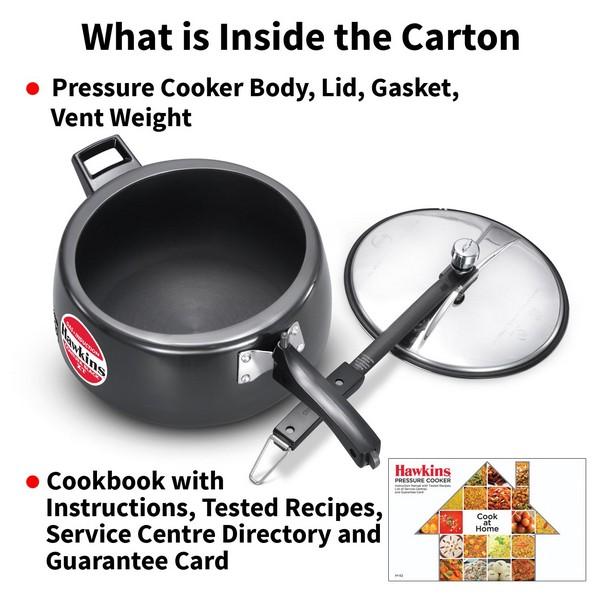 You can prepare your favourite meals in a jiffy with the efficient Hawkins Contura Aluminium Pressure Cooker. It is designed with rounded sides that make stirring, removing, and viewing your food convenient. Built with an inside-fitting lid, this pressure cooker keeps the pressure locked for safety and efficiency while cooking. Moreover, a safety valve is situated below the lid's handlebar, which deflects the steam in a downward direction to prevent burns.