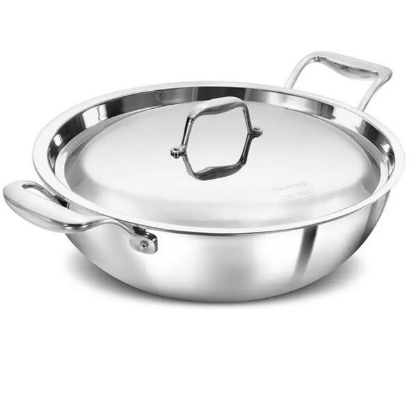 Hawkins Pro Triply Stainless Steel Deep-Fry Pan (Kadhai) is engineered for culinary excellence, achieving professional results every time. Featuring a robust tri-ply stainless steel construction, this pan ensures that food cooks evenly without sticking or burning, even with minimal oil, guaranteeing optimal cooking performance. Designed for your comfort and safety, the stay-cool handles allow for easy and secure handling, even when the pan is hot. Whether you're using gas, induction, or the oven, this deep-fry pan adapts effortlessly to various cooking methods, offering versatility and convenience in the kitchen. The stainless steel rivets ensure that the pan remains sturdy and stable, preventing any concerns about loosening or durability. The pan is dishwasher safe, making maintenance a breeze and freeing up more time for culinary creativity. Complete with an elegant, food-grade, extra-thick lid equipped with a stay-cool handle, this deep-fry pan combines functionality with style.