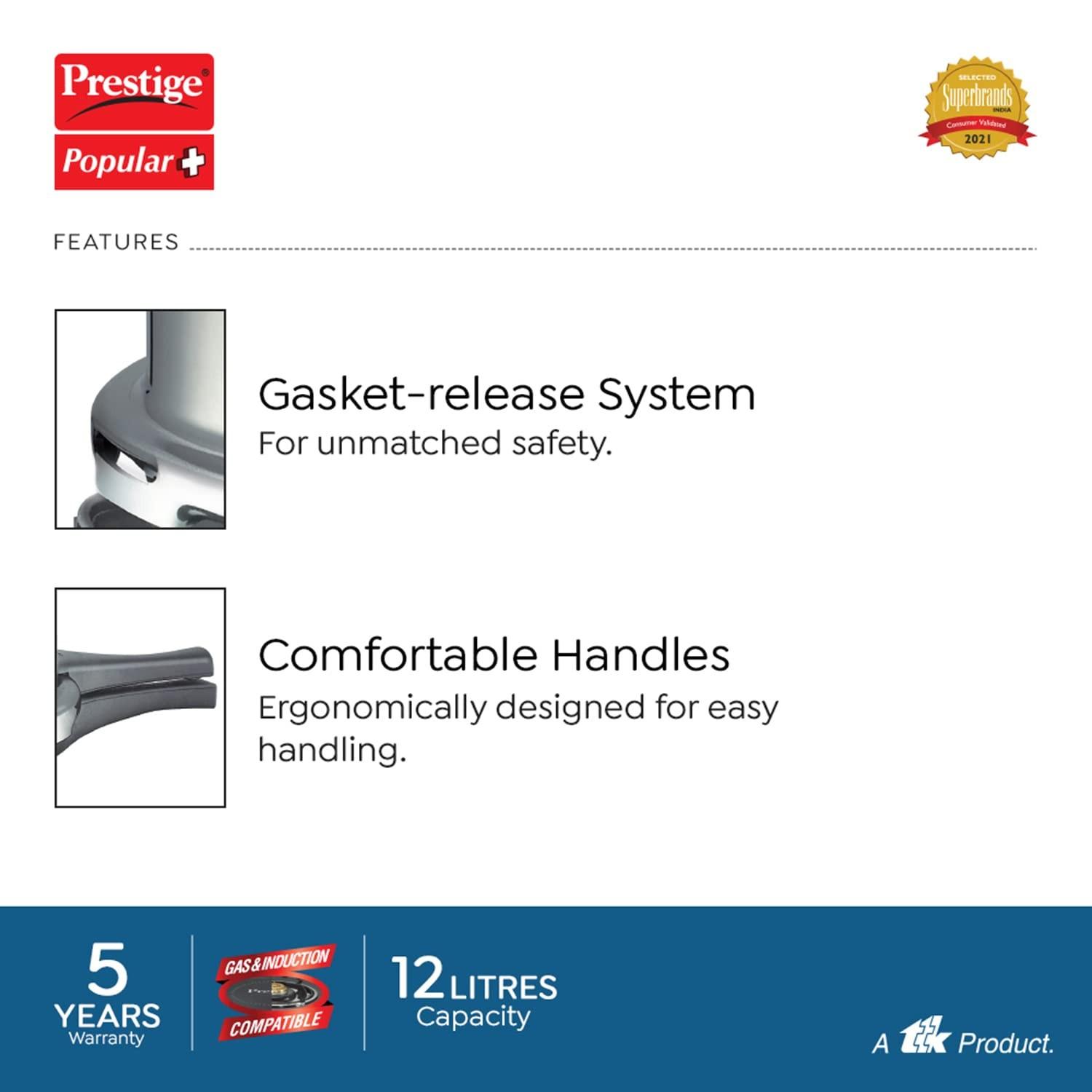 BODY: Prestige Popular is an outer lid pressure cooker made from virgin aluminium which is light in weight and long lasting. The outer lid feature is suitable for both separator cooking and direct vessel cooking.