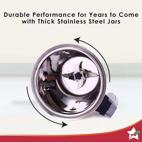 Highly Efficient Jars: Superior quality food-grade plastic and stainless steel jars come with flow breakers for finest results.