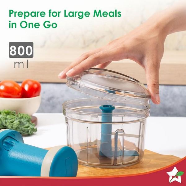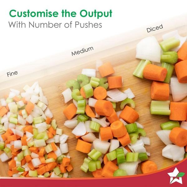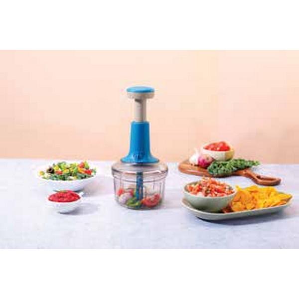 Chop vegetables, nuts, and other hard ingredients with ease. Surgical grade blades at different heights for perfect dicing and chopping. Control the size of the pieces with the number of pushes. Firm antislip grip, unique locking mechanism.