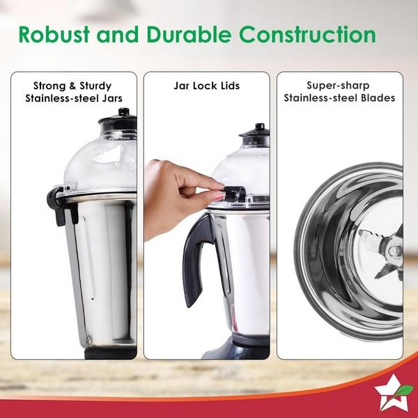 Robust Build Quality: With base made of high quality ABS and jars and blades made of food-grade stainless steel, the machine can withstand heavy-duty usage.