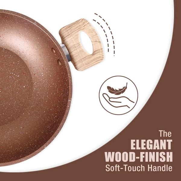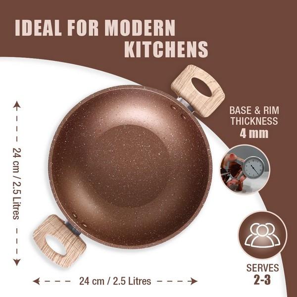 STYLISH COOKWARE - Duralife Die-cast Kadhai with lid adds elegance to your kitchen with its copper colour and wood-finish soft-touch handles, offering a comfortable grip.