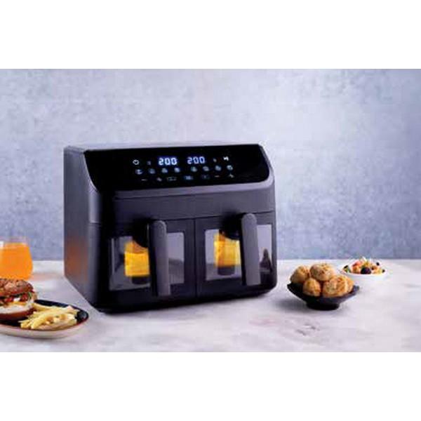 Cook healthy and crispy snacks with almost no oil. Simultaneously cook 2 different dishes in 2 separate baskets and 2 different ways. 8 Pre-set functions including baking, grilling, frying, roasting. Window and interior lights to help you monitor the cooking. Comes with digital display and 2 independent touch controls. 2000W | 9L