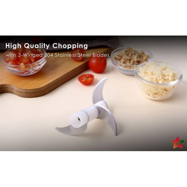 High-performance and easy to use, the Wonderchef Zippy Cordless Chopper is an ideal addition to your kitchen. At the simple press of a button, its easy operation allows it to chop ingredients. Additionally, with up to 30 W motor, this chopper ensures that you can chop everything in as little as 30 to up to 45 seconds. This chopper makes chopping onions, chillies, tomatoes, garlic, ginger, and nuts quick and easy. Furthermore, it features three 304-grade stainless steel sharp blades that deliver consistent results.